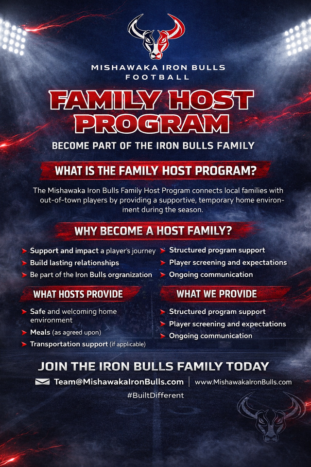 The Mishawaka Iron Bulls Football Club Family Host Program is a community-based initiative designed to support our athletes by providing a safe, welcoming, and stable living environment during the football season. This program reflects our belief that strong community relationships are essential to building a successful and sustainable football organization.